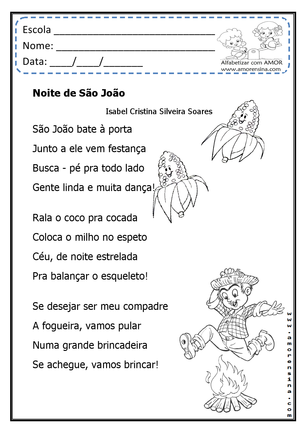 Atividades Festa Junina. Estas atividades são compostas de quatro páginas, sendo a primeira com um poema de três estrofes. Aliás, o poema pode também ser utilizado até para o 3º ano. As outras três páginas trazem as atividades de interpretação do poema, sendo elas, mais compatíveis com as crianças do 1º e ou 2º ano, conforme o.