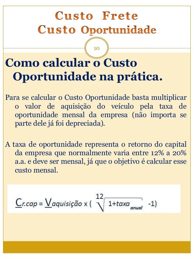 Como calcular o Custo de Oportunidade. Não existe uma fórmula para calcular o custo de oportunidade uma vez que se trata de um conceito muito subjetivo. Nos casos em que é possível mensurar o custo de oportunidade, geralmente o cálculo é feito a partir do lucro que se ganharia com a opção que não foi a escolhida.