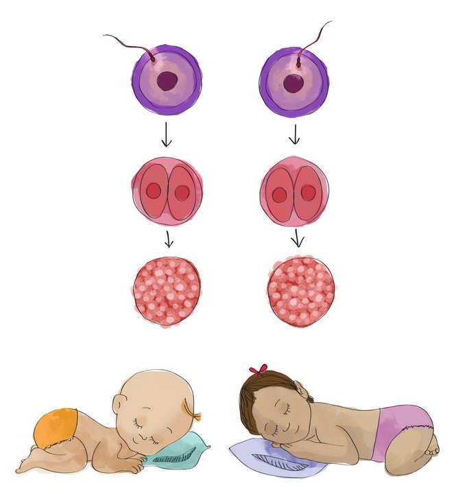 Os gêmeos fraternos não são idênticos, pois são provenientes de óvulos diferentes. Durante a ovulação, a mulher libera dois ou mais óvulos e cada um é fecundado por um espermatozoide. Os zigotos formados vão se desenvolver independentes um do outro, em placentas diferentes. A constituição genética destes gêmeos é diferente, como.