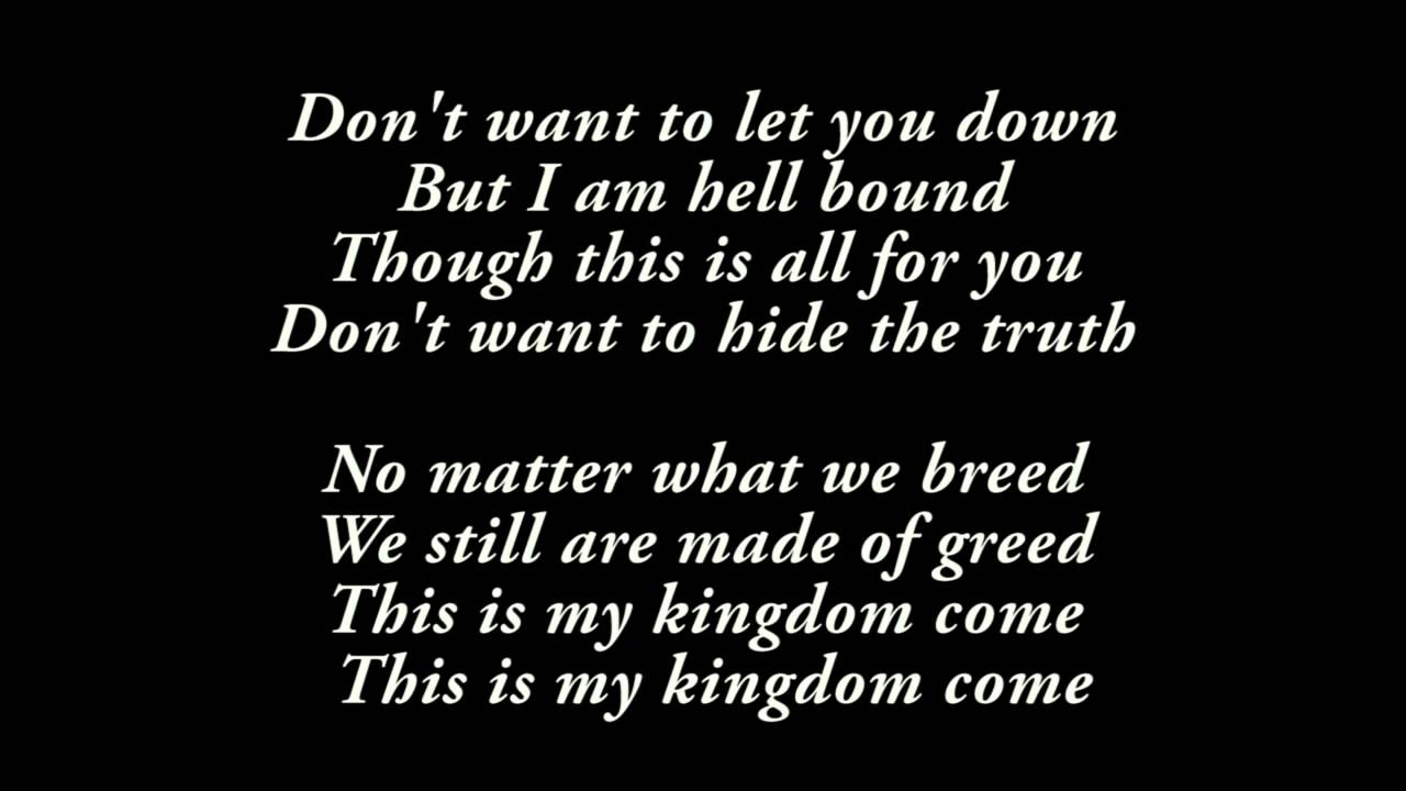 Will come calling out At the mess you've made Don't wanna let you down But I am hell-bound Though this is all for you Don't wanna hide the truth No matter what we breed We still are made of greed This is my kingdom come This is my kingdom come When you feel my heat Look into my eyes It's where my demons hide It's where my demons hide Don't get.