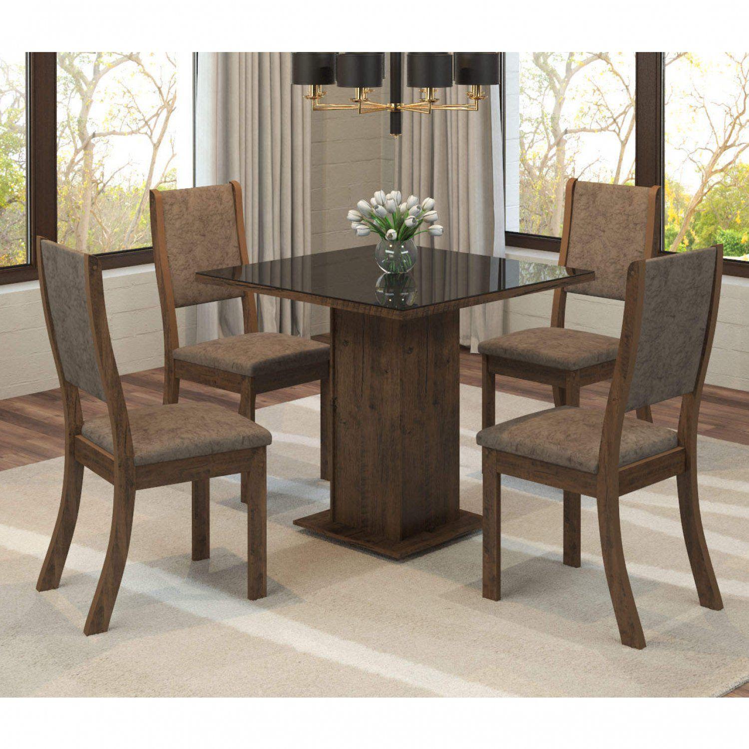 Conjunto Sala de Jantar Mesa Quadrada Tampo MDF Luana 4 Cadeiras Kiara Viero Grigio/Canela/Vidro
