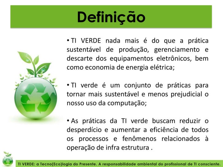 Mas, afinal, o que é TI verde? Cada vez mais utilizado no século XXI, o TI verde é um conjunto de ações que torna o processo de produção de equipamentos menos prejudicial ao meio ambiente. O objetivo é produzir produtos que consomem menos energia, evitar a utilização de metais pesados e o uso de componentes químicos e tóxicos, além.