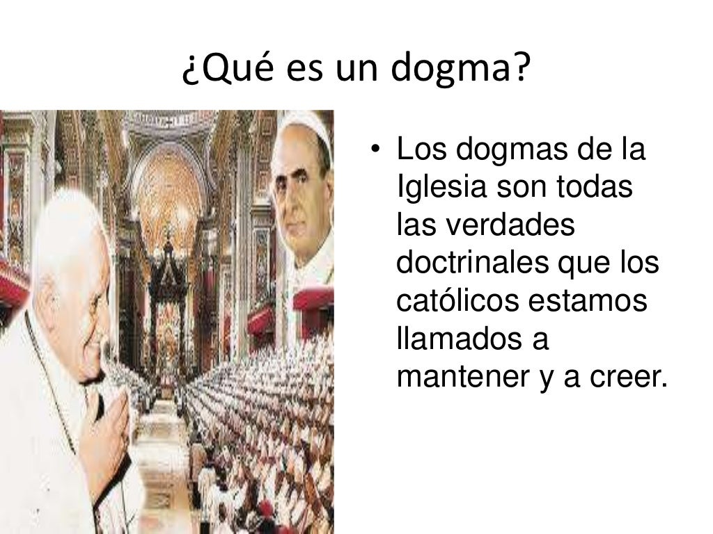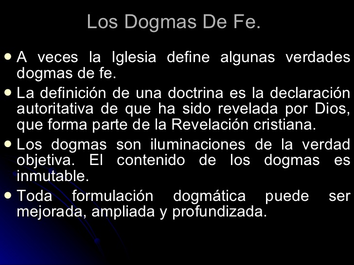 Os dogmas são definidos pela autoridade que Cristo concedeu à sua Igreja utilizando uma forma que obriga o povo cristão a uma adesão irrevogável da fé, propõe verdades contidas na revelação divina ou verdades que com estas tem uma conexão necessária. " Há uma conexão orgânica entre nossa vida espiritual e os dogmas, pois são.