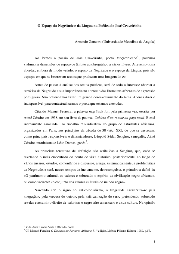 (PDF) O Espaço da Negritude e da Língua na Poética de José Craveirinha Guilherme Nhassengo