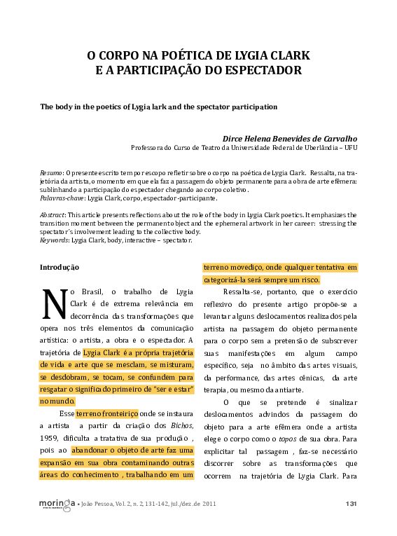 (PDF) Corpo na Poética de Lygia Clark por Dirce Helena Benevides de Carvalho carolina turino