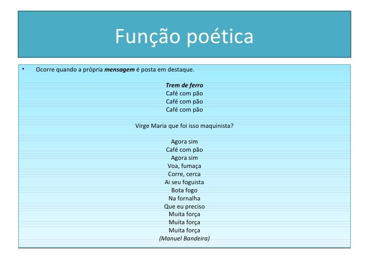 A Função Poética caracteriza-se pela preocupação com a forma do discurso, ou seja, o modo utilizado para transmitir uma mensagem.. Essa função da linguagem é encontrada nas obras literárias, e muitas vezes é confundida com a função emotiva. Lembre-se que na função poética, o mais importante é a mensagem em si.Já o principal objetivo da função emotiva é emocionar, ao mesmo.