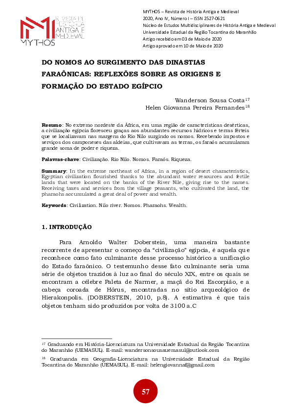 (PDF) DO NOMOS AO SURGIMENTO DAS DINASTIAS FARAÔNICAS REFLEXÕES SOBRE AS ORIGENS E FORMAÇÃO DO
