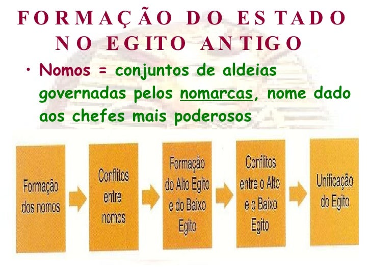 No começo, o Egito era habitado por povos que viviam em clã, os nomos. Os nomos eram independentes, mas cooperavam quando havia problemas comuns, como abrir canais de irrigação, construir diques. As relações desses se transformaram até a formação do Reino do Baixo Egito, ao norte, e o Reino do Alto Egito, ao sul.