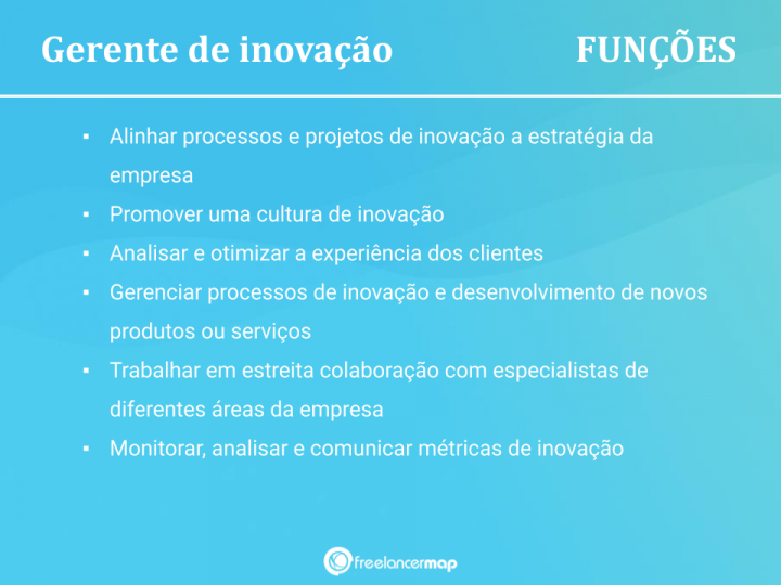 O que faz um gerente de inovação? O gerente de inovação têm a tarefa de criar a estratégia e a cultura necessárias para que os funcionários experimentem os recursos certos no nível certo para apoiar essa experimentação. Os gerentes de inovação são hábeis em gerenciamento de projetos, pensamento estratégico e liderança.