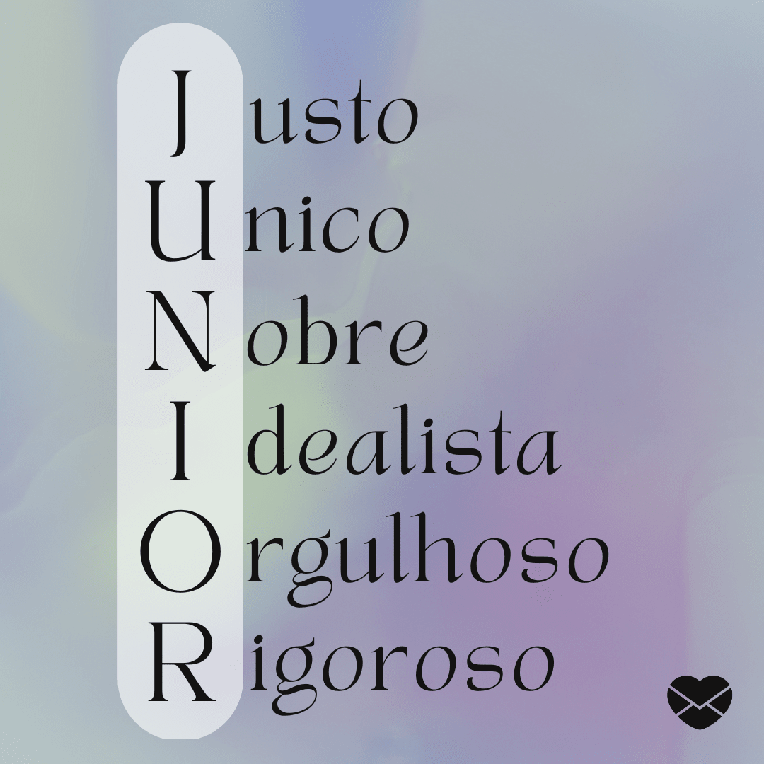 Júnior: Significa " jovem ", " o mais novo ", " filho do pai ". Júnior é um belo nome predominantemente masculino que reflete em seu significado o orgulho e a alegria paterna pelo seu filho. Isto acontece, pois o nome Júnior é geralmente utilizado como um complemento do nome do filho quando ele recebe o mesmo nome do pai ou do avô.