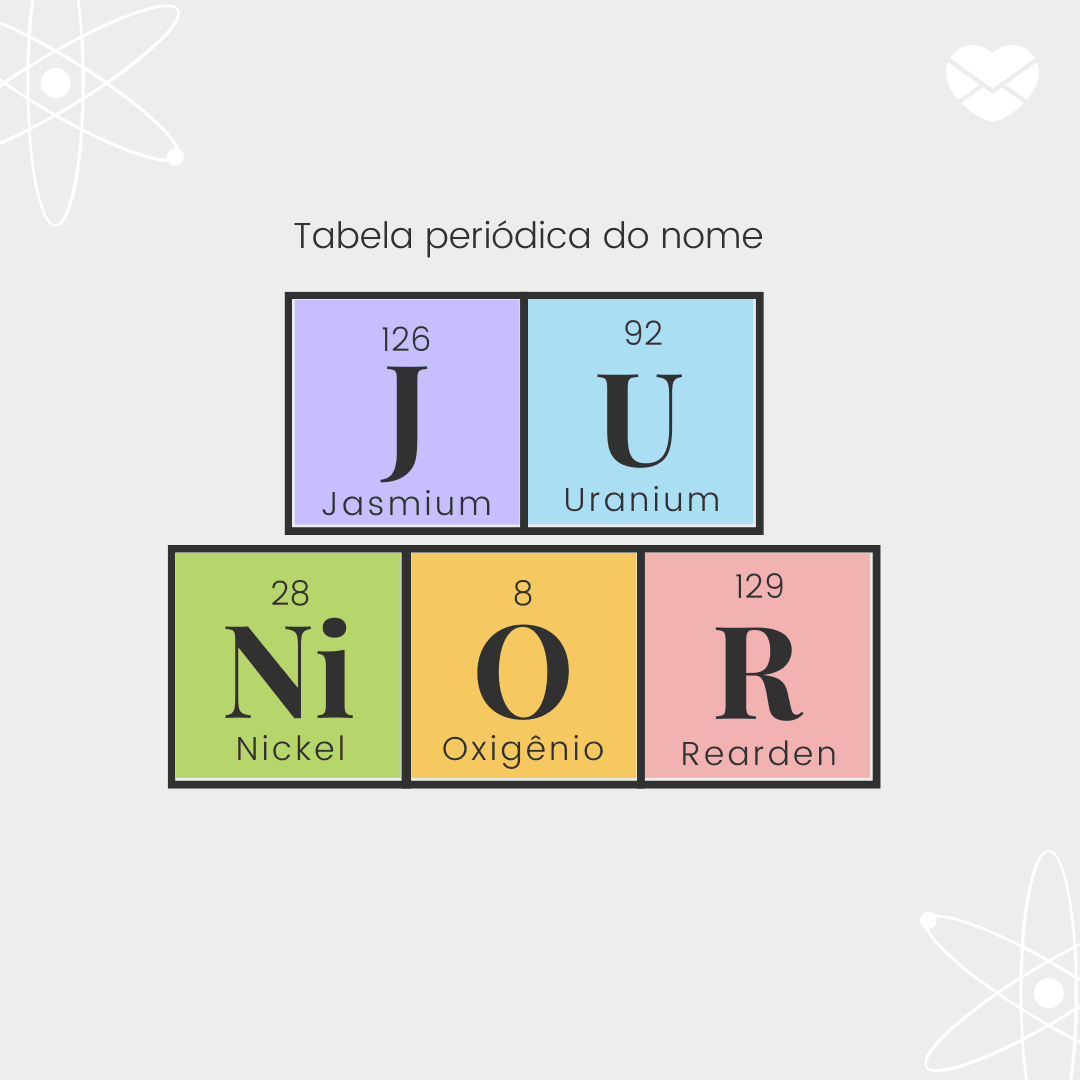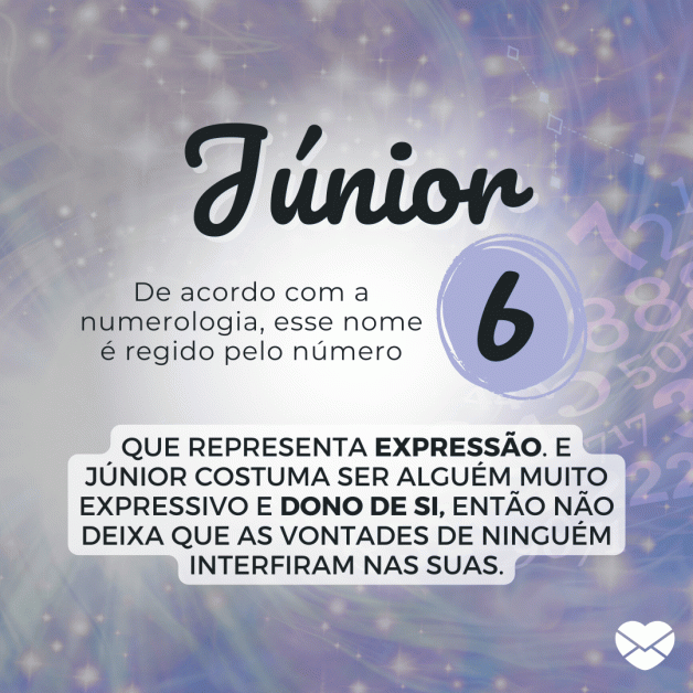 Significado do nome Junior: Inglês - Jovem, rapaz. O nome JUNIOR tem como número da sorte o número 6. Carinhosa, compreensiva, e responsável é passional e humanista. Com uma grande necessidade de ajudar os outros, ela pode até se sacrificar pelos que ama. Negativo: Utopia, Mártir, Ciúmes, Ressentimento, Dificuldade em aceitar a realidade.