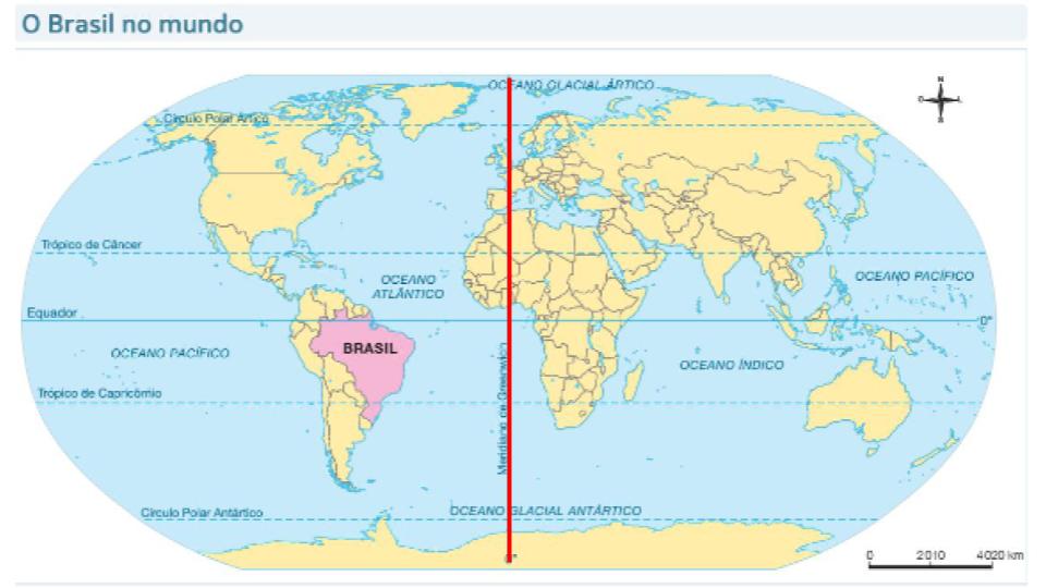 Os extremos do território brasileiro. O território brasileiro está localizado, em sua totalidade, a oeste do meridiano de Greenwich, portanto sua área está situada no hemisfério ocidental.