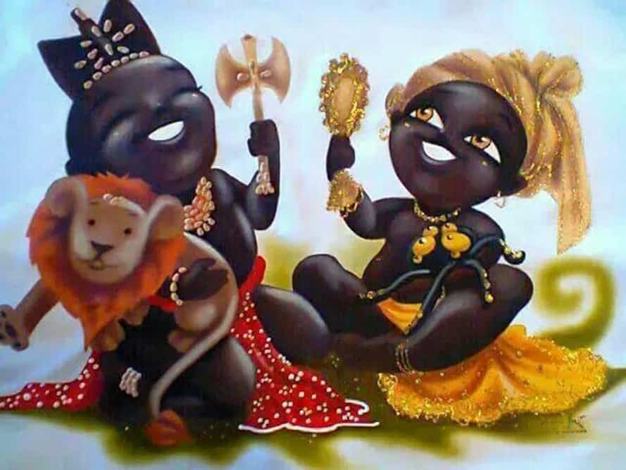 Erês - A personificação da alegria. Representados como crianças gêmeas, os Erês são divindades que fazem o ambiente se encherem com alegria e felicidade no ritmo da música, tanto que quando uma sessão de terreiro muito contagiante e alegre, diz-se que estava povoada de Erês.