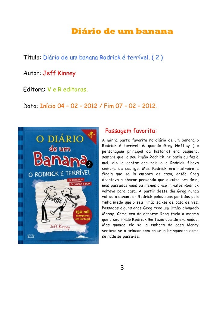 Sinopse. Não é fácil ser criança. E ninguém sabe isso melhor do que o Greg Heffley, que se vê aprisionado na escola preparatória, onde fracotes minorcas dividem os corredores com miúdos mais altos e malvados que já fazem a barba. Em O Diário de um Banana, o autor e ilustrador Jeff Kinney apresenta-nos um herói improvável.