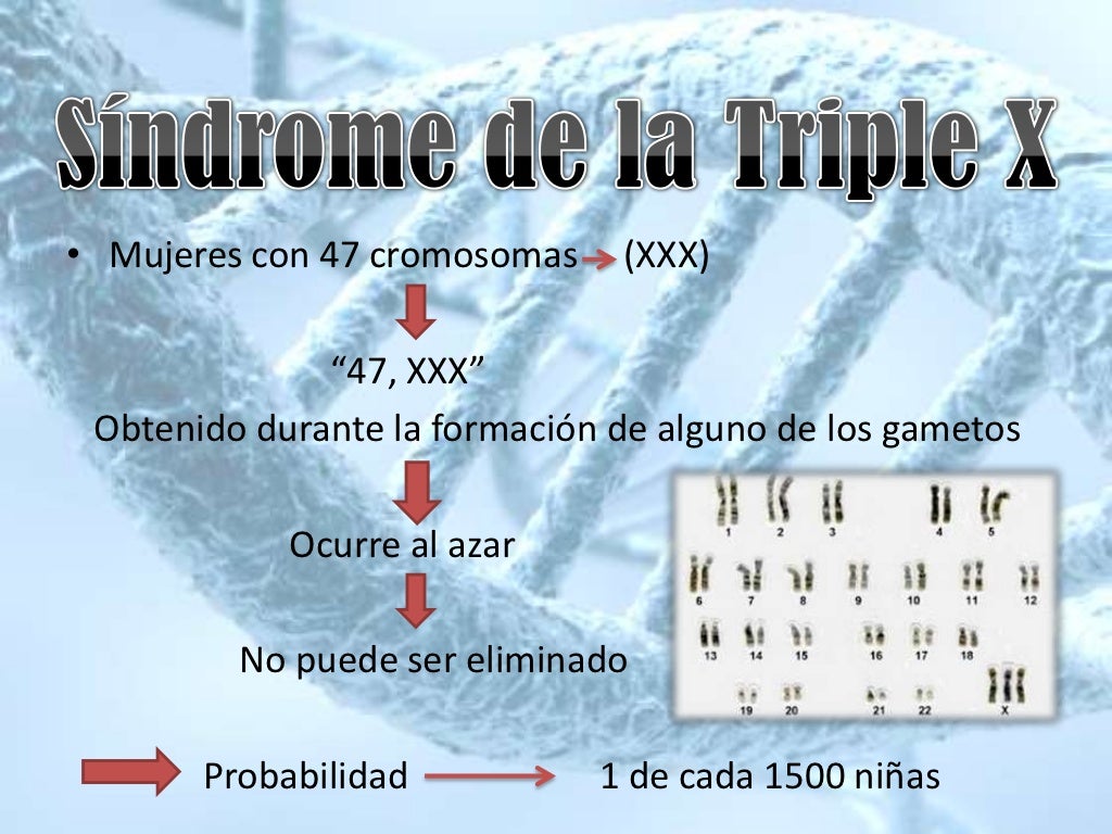 Perspectiva general. El síndrome triple X, también llamado trisomía X o 47,XXX, es un trastorno genético que afecta a aproximadamente 1 de cada 1000 mujeres. Las mujeres normalmente tienen dos cromosomas X en todas las células, un cromosoma X de cada padre. En el síndrome tripe X, las mujeres tienen tres cromosomas X.