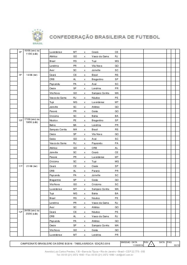 1. CAMPEONATO BRASILEIRO DA SÉRIE B TABELA BÁSICA / EDIÇÃO 2016 1 2 3 001 1ª Ceará CE x Paysandu PA 002 1ª Bahia BA x Avaí SC 003 1ª Sampaio Corrêa MA x Vasco da Gama RJ 004 1ª Oeste SP x Atlético GO 005 1ª Vila Nova GO x Bragantino SP 006 1ª Luverdense MT x Joinville SC 007 1ª Tupi MG x Goiás GO 008 1ª Brasil RS x Paraná PR 009 1ª Londrina PR x CRB AL 010 1ª Criciúma SC x.